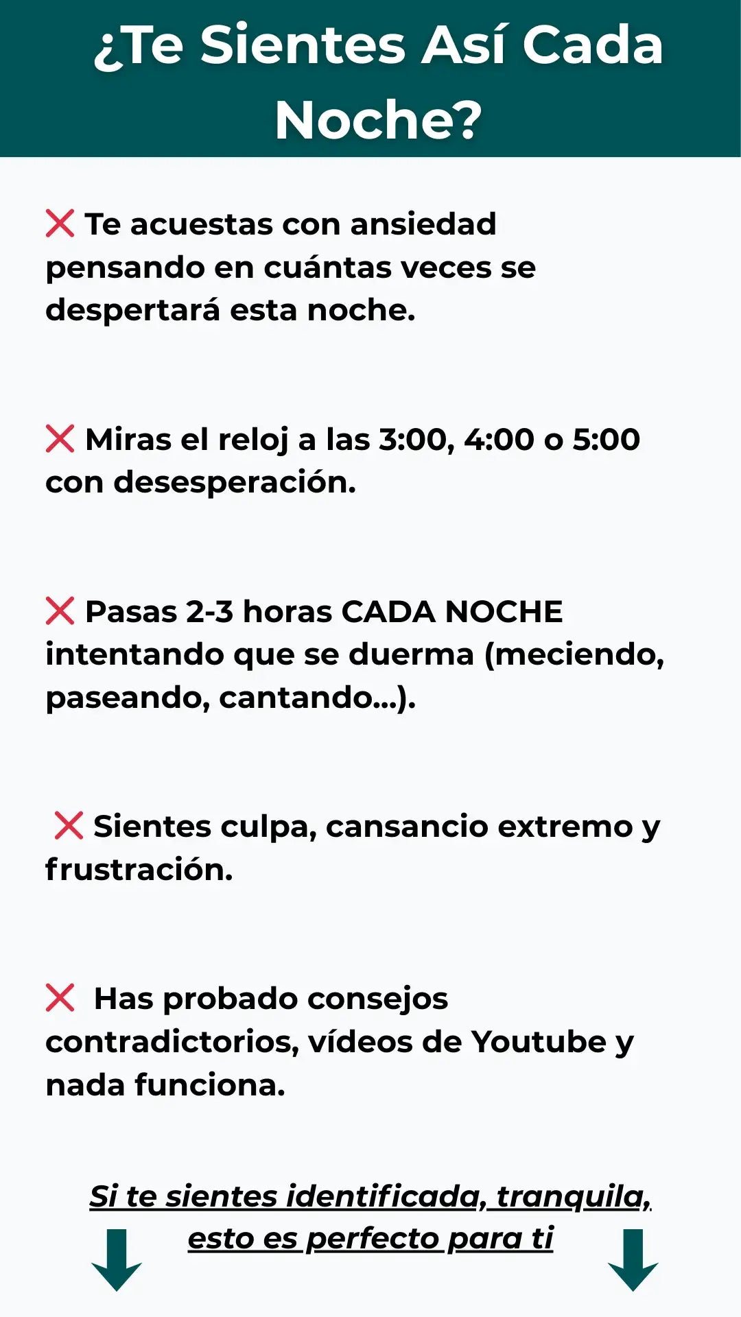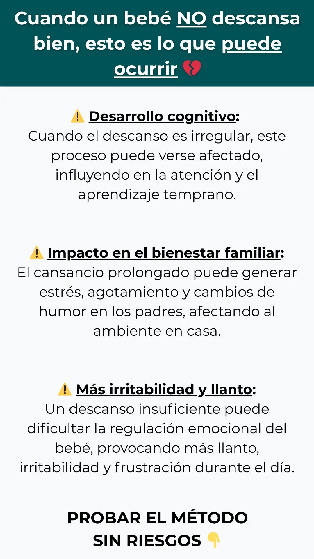 El ÚNICO riesgo que tienes es seguir igual: noches sin dormir, estrés y un bebé que no descansa (y puede afectar de manera negativa a su desarrollo).