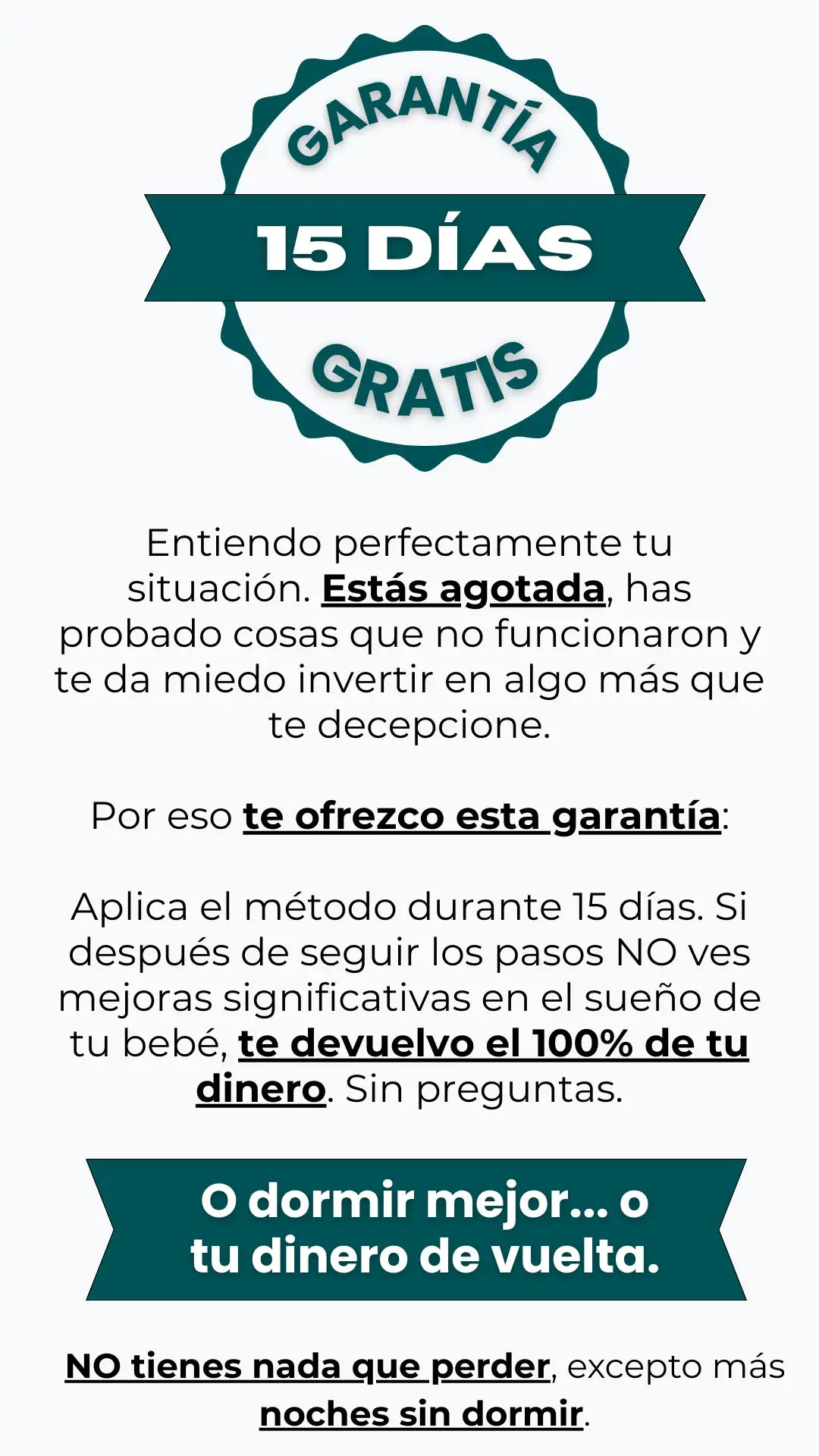 Si aplicas el método durante 15 días y NO ves mejoras significativas en el sueño de tu bebé, te devuelvo el 100% de tu dinero.